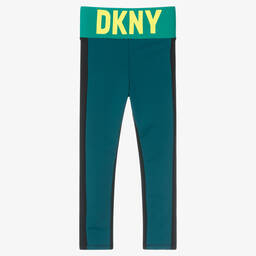 Sporty pink and black colourblock leggings for girls by American brand DKNY. Full length, they have a pale pink logo on the wide, elasticated waistband and one leg. They are made in ultra-lightweight and comfortable polyamide jersey.