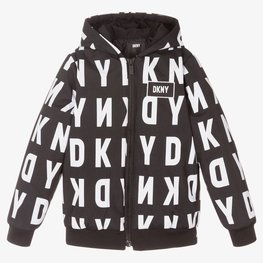 Logo-inspired black hooded jacket for teen boys, by DKNY. With a statement all-over white logo design, it has a monochrome logo badge on the chest, side seam pockets, stretchy, ribbed cuffs, and warm padding.