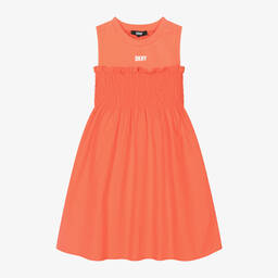 Teen girls white shirred dress by DKNY offers a blend of casual and stylish elements. Crafted with a lightweight poplin skirt and a soft jersey bodice, this dress features a shirred waist for a flattering fit and flare silhouette. The sleeveless design is adorned with a black logo on the front, making it perfect for spring and summer wear. Limited quantities available, so don't miss your last chance to buy this elegant piece.