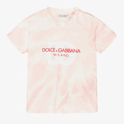 Blue tie-dye T-shirt for little boys by luxury Italian designer Dolce & Gabbana, made in soft and stretchy cotton jersey. There is a white Crossover DG logo on the front, with a navy blue logo across the top. This eye-catching T-shirt has useful popper fastenings on one shoulder for easy dressing.