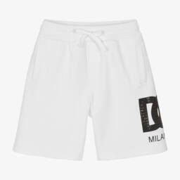 Sporty white shorts for little boys by luxury Italian designer Dolce & Gabbana, made in soft cotton jersey. Detailed with navy blue stripes down the sides, these retro-inspired shorts have a DG Sport logo appliqué on one leg and a comfortable drawstring waist.
