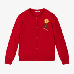 From luxury Italian brand Dolce & Gabbana and directly inspired by their adult collection, a gorgeous coral red and black leopard print cardigan for girls. This oversized, heavy-knit style is made in beautifully soft mohair with an iridescent effect, and has a silky satin lining. Fastening with concealed poppers, it has stylish black and gold logo buttons on the front, with large patch pockets.