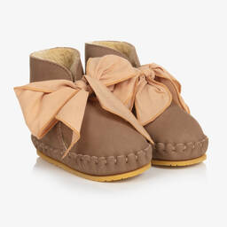 In a lovely shade of beige with a hint of pink, these sweet boots for baby girls are from Donsje. Handmade in soft premium leather, they are fully lined in soft faux fur for comfort. They fasten with a fabric ribbon bow, to allow for an adjustable, comfortable fit. Ideal for taking those first steps, larger sizes have flexible rubber soles, while the smaller sizes have a soft suede leather outer sole.