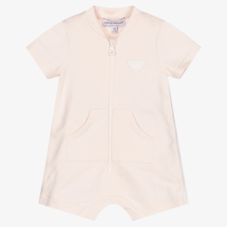 Navy blue cotton shortie for baby boys by Emporio Armani. Made in soft and stretchy jersey, this comfortable babysuit has the designer's rubberised Eagle logo appliqué in white on one front pocket and logo-embossed taping on the sides. It fastens with a branded zip on the front and concealed poppers between the legs.