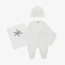 Adorable blue babygrow, hat and bib set for boys by luxury Italian brand, Emporio Armani. All three pieces are made in beautifully soft cotton jersey and patterned with the designer's distinctive Eagle logo in contrasting shades of blue. The babygrow and bib fasten with logo-embossed poppers for an added designer touch and the set is presented in a branded organza pouch.