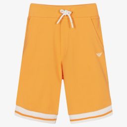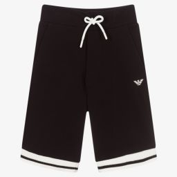 Boys blue cotton shorts by Emporio Armani. Made in soft and stretchy piqué, these comfortable shorts have the designer's Eagle logo print, two front pockets, and blue and white ribbed trims. There is a faux drawstring detail on the elasticated waist.