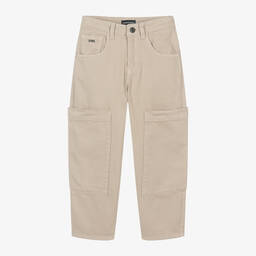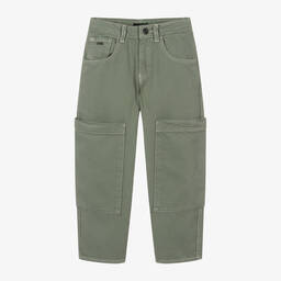 Boys green twill cargo trousers by Emporio Armani are designed in a relaxed fit. Made in soft, mid-weight cotton twill, these trousers feature five-pocket jeans styling with additional large pockets on each leg for a cool cargo look. The iconic Eagle logo in antiqued silver tone accents the back and coin pockets. They have button and zip fastenings, along with a useful adjustable waistband for a good fit. Limited quantities available, so don't miss out!