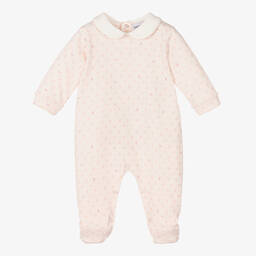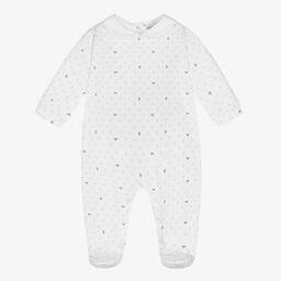 Sweet navy blue babygrow for boys, by luxury Italian brand Emporio Armani. Made in soft cotton jersey, it has a traditionally-styled Peter Pan collar and an all-over pink Eagle logo print. It fastens with poppers on the back and between the legs, embossed with the brand's Eagle logo.