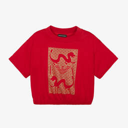 Girls ivory and gold dragon T-shirt by Emporio Armani is a luxuriously soft top made from a blend of lyocell and cotton jersey. Featuring a shimmering gold foil dragon and logo print, this T-shirt is designed for special Lunar New Year celebrations. The short-sleeved design has dropped shoulders and an elasticated hem, offering both style and comfort. Last chance to buy as quantities are limited.