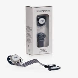 Baby girls pink dummy and clip set with the eagle logo branding by Emporio Armani. The dummy has an anatomical silicone teat with a hard plastic holder and a clip with a striped fabric strap to fasten onto clothing.