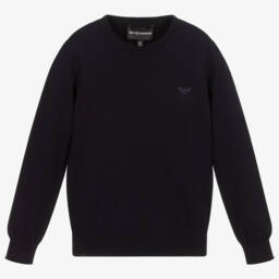 A striped sweater for teen boys by Italian brand Emporio Armani, with a bold, rubberised logo on the front. In complementary shades of beige, ivory and green, this warm pullover has been knitted in differing patterns for added texture and a contrast finish. It is made in a mid-weight wool blend, making it an ideal choice for layering in colder temperatures.