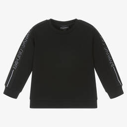 A dark blue sweatshirt for teen boys by luxury brand Emporio Armani. Distinctively designer, it has the iconic Eagle logo on the front, patterned in a smooth houndstooth design, with a GA logo embroidered within. Casual and comfortable, it is made in soft cotton jersey.