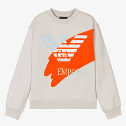 Logo-inspired purple sweatshirt for teen girls by Emporio Armani. In a relaxed boxy fit, this organic cotton sweatshirt has a blue and white logo Eagle embroidery on the front, and bright orange flocked panel for a stand-out pop of colour. This item is made using less chemicals and less energy for an eco-conscious impact.