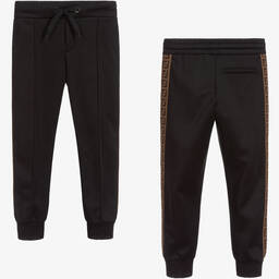 Smart navy blue joggers for boys by luxury brand Fendi, made in polycotton jersey. They have a stitched seam down the front legs, with brown 'FF' logo tape down the sides. The waistband is elasticated and has drawstring ties.