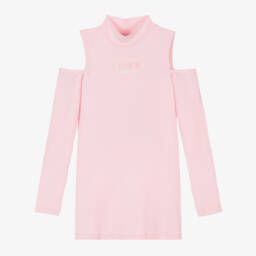 Stylish pink dress for girls by luxury designer, Fendi. Made in soft cotton jersey, it has the iconic logo flocked on the front for a branded vibe and contemporary cut-outs on the shoulders.