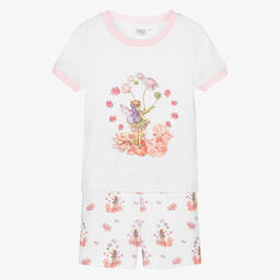 Girls white cotton pyjama set by Flower Fairies™ by Childrensalon offers a charming bedtime look with its whimsical floral and fairy print in soft pink, green, and yellow. Crafted from cosy, stretchy jersey, this short-sleeved set features pink ribbed trims for added comfort. Suitable for dreamy nights, it's designed to keep little ones snug and stylish. Limited quantities available, so secure this enchanting set for your child's wardrobe now.