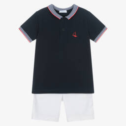 The blue and yellow polo and short set for boys by Foque combines style and comfort. Crafted from soft piqué, the polo features a charming yellow sailing boat embroidery and striped trims. The chino-style shorts, made from soft twill, offer an adjustable waistband and slanted front pockets for a perfect fit. Ideal for the spring and summer seasons, this set is available in limited quantities, making it a last chance to buy for a stylish wardrobe addition.