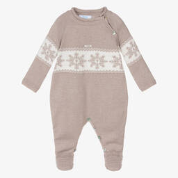 Adorable grey knitted babygrow for boys and girls by Foque, patterned with a beige squirrel on the front. Beautifully soft and with a touch of alpaca for a luxurious feel, it has a ribbed collar and ivory stripes on the cuffs and leg. There are buttons to fasten on the back and between the legs, and the designer's pearlised logo can be seen on the front for a discreet branded finish.