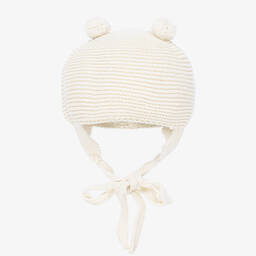 Cute red hat for little boys and girls by Foque, knitted in a soft wool blend. It has two small pom-poms on the top and ties under the chin to ensure a secure fit.