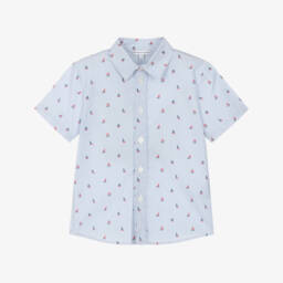 This white and blue floral blouse by Zimmermann captures a vintage charm. Made in a lightweight fabric, it features a vibrant floral print in shades of blue and brown, accentuated by teal trims. The short-sleeved design and classic collar add a timeless touch.