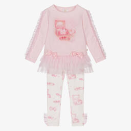 This charming pink leggings set by Caramelo Kids captures a magical fairytale theme that little girls will adore. Made in soft cotton jersey, the top showcases an enchanting castle and carriage print with pretty ruffles and bows adding a delightful touch. The Peter Pan collar adds a classic element, whilst the leggings offer comfort and ease of movement, ideal for everyday wear.