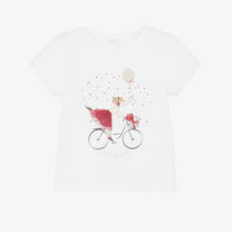 Girls white T-shirt by Lili Gaufrette, made in soft cotton jersey. This casual tee has a charming girl on a bicycle print, with a glittery gold balloon and a red tulle skirt.