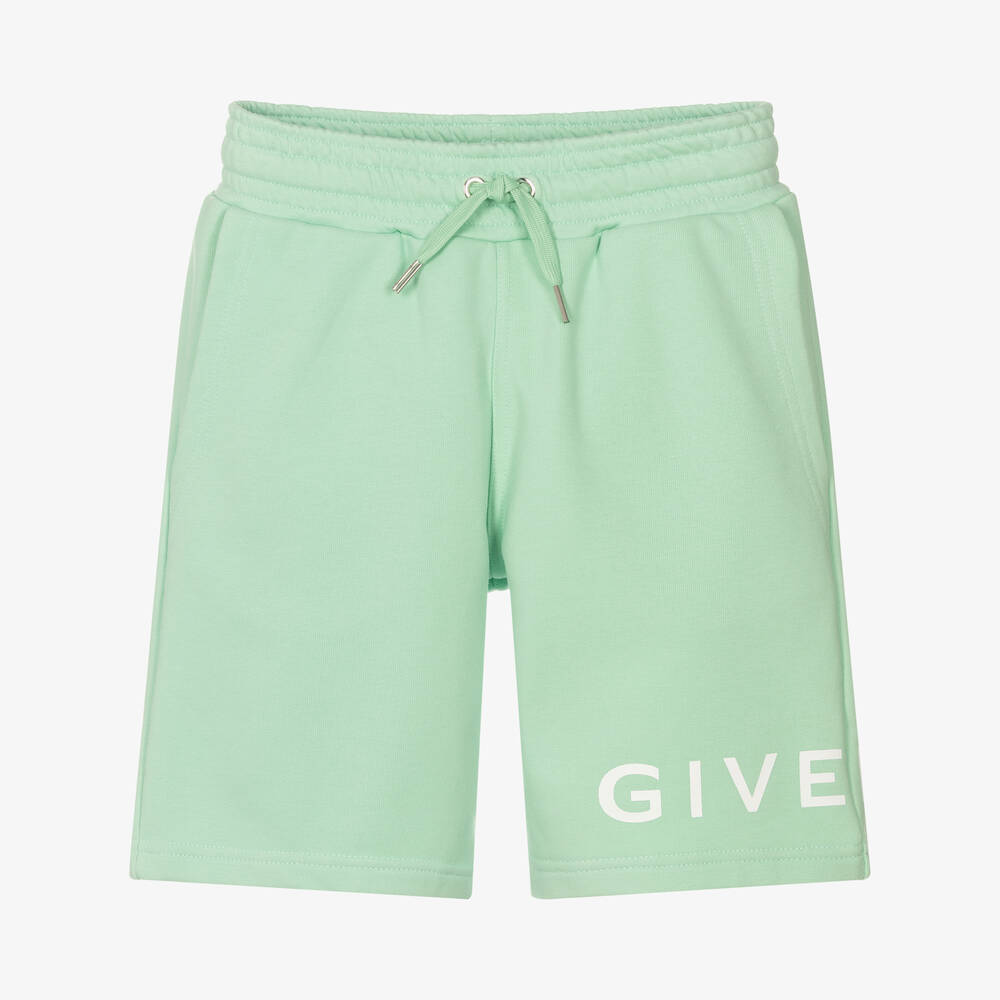 Pale green shorts for teen boys by luxury French brand Givenchy, made in comfortable mid-weight cotton jersey. As seen in the main collection, they have a large white logo print on one leg and a 4G logo on the back. The elasticated waist has an adjustable drawstring with branded end caps and there are useful pockets on the front and back.