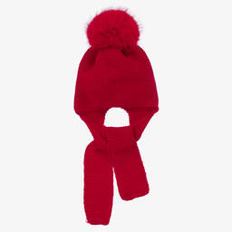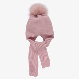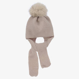 This ivory hat for baby boys and girls is from Gorros Navarro. Softly knitted, it has an attached scarf to help keep them warm and cosy in the colder months. The removable, popper-fastening pom-pom on the top is made from super-soft faux fur.