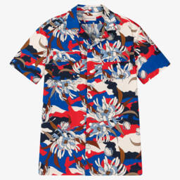 Boys Navy Blue viscose print shirt by Gucci features a whimsical strawberry smoothie and 'Gucci Marveilleux' design in vibrant red, green, and black hues. Crafted from soft, lightweight viscose, it includes front button fastenings and vented sides for ease of wear. Suitable for spring and summer outings, this unique piece offers limited quantities, making it a last chance to buy for those seeking a touch of Italian luxury.
