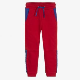 Black organic cotton joggers for younger boys by Guess, with pale green trims. Made with soft and stretchy sweatshirt jersey, there are useful front pockets, green logo tape on the sides and soft ribbed cuffs. There is a branded drawstring on the elasticated waistband for a comfortable fit.