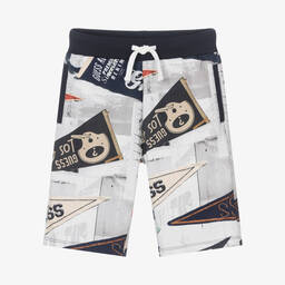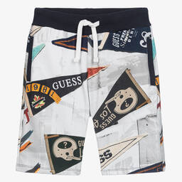 Cool white and grey shorts for boys by Guess, printed with colourful flag logos and slogans. There are two pockets on the front and one on the back with the iconic triangle logo printed in red and white. Adjustable with a white drawstring for a good fit, the ribbed waistband is in a contrasting navy blue. These comfortable Bermuda length shorts are made in soft cotton sweatshirt jersey.