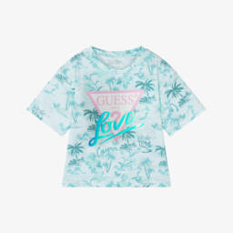 Navy blue cotton T-shirt for junior boys by American brand Guess, made in comfortable jersey for relaxed days. It has the designer's shiny, rubberised navy blue logo on the front, with white overstitching on the cuffs and hemline. This T-shirt contains in-conversion cotton fibre.
