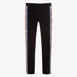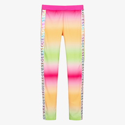 Striking brown leopard print lightweight leggings for teen girls by Guess, made in stretchy polyester. They have white logo taping along the sides of the legs, with shiny black logo prints.
