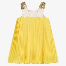 Girls special occasion dress from Hucklebones London, exquisitely pleated in sheer blue chiffon. An elegant trapeze design with a beautiful flared shape, it has an pink crêpe empire neckline with shimmering pink lamé bows on the shoulders. Lined in soft satin with a tulle layer for extra volume, the dress fastens with gold buttons on the back.