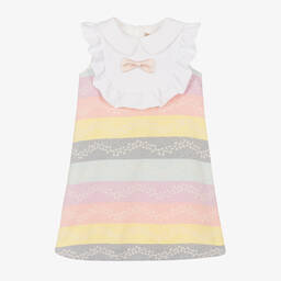 Exclusive to Childrensalon, a sky blue shift dress by Hucklebones London. Made in soft woven twill with a slight sheen, this lovely design has a contrast white ruffle bib and a blue Peter Pan collar and bow appliqué. Fully lined in shiny satin, it fastens on the back with a concealed zip.