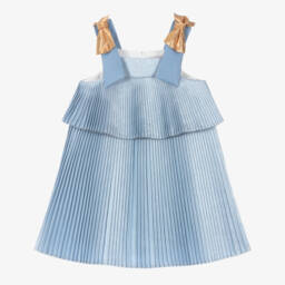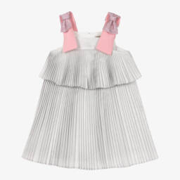 Striking glittery silver dress for girls by British brand Hucklebones London, ideal for a special occasion and exclusive to Childrensalon. Finely pleated, with a deep ruffle around the bodice, it has fixed pink and sparkling pink bows on the shoulder straps. There is an underskirt of frilled tulle for extra volume and a lightweight satin lining for comfort. It fastens with shiny silver ball buttons on the back for a pretty finish.