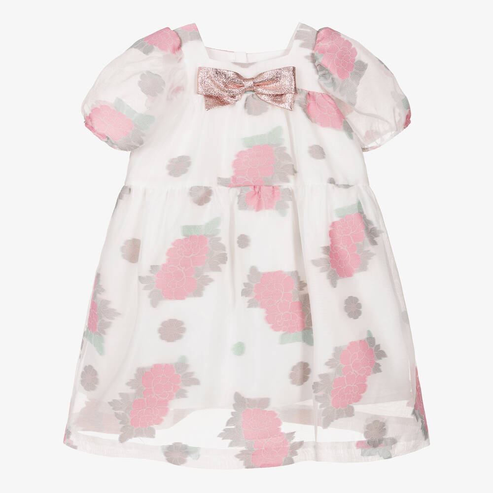 Puffed white organza dress for girls by Hucklebones London. Lightweight with a lovely sheen, this special occasion dress has a pink flower jacquard pattern and a sparkly rose gold bow on the front. It has a silky satin underlayer, a lightweight cotton lining for comfort, and fastens subtly with a concealed zip on the back.