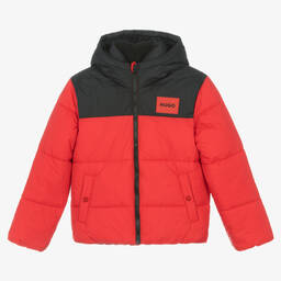 Blue and black puffer jacket for teen boys by HUGO, with a distinctive rubberised logo patch on the chest in the brand's signature red. Warmly padded, it is made in a silky smooth fabric, with a fleecy neck lining and a large protective hood. Fastening on the front with an exposed black zip, it has fleece-lined pockets, with logo-embossed popper fastenings, for that extra branded touch. There is a useful, internal velcro fastening slip pocket for securing small belongings.