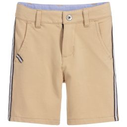 Boys beige shorts by iDO Baby. Made in soft and stretchy cotton jersey, they have black, beige and white striped tape on the seams.