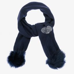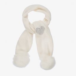 Girls knitted scarf by iDO Baby, in fuchsia pink. Made from a blend of wool and cotton, it has a bright sparkly diamanté heart logo and fun faux fur pom-poms on the ends.