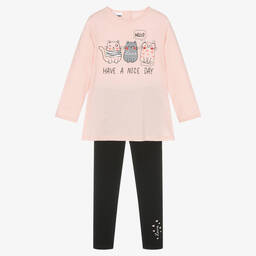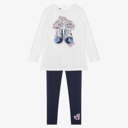 Adorable orange and white leggings set for girls by Italian brand iDO Baby, made in super soft cotton jersey. The long-sleeved T-shirt has a girl and bear printed on the front, with diamanté and glitter details. There are button fastenings on the back. The leggings have sparkly hearts printed on one leg, and a comfortable elasticated waistband for an easy-to-wear outfit.