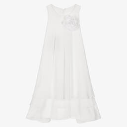Turquoise green dress for girls by Italian brand iDO Junior, made in delicate layers of chiffon with a soft silky lining. It has a tulle flower appliqué on the front and diamanté button fastenings on the back.