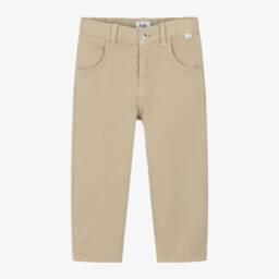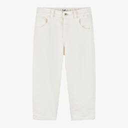 Boys ivory soft denim trousers by Il Gufo offer an elegant blend of comfort and style. Made from a luxurious jersey denim, they feature a four-pocket design and an adjustable waistband for a snug fit. The zip and button fastening allows ease of wear, while a subtle logo tab adds a touch of sophistication. Suitable for adding a stylish flair to any outfit, these trousers are available in limited quantities.