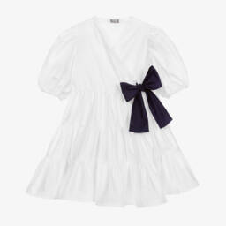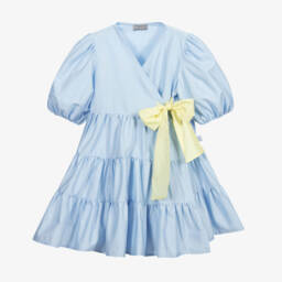 A pale blue wrap-over dress for girls by Il Gufo, made in soft cotton poplin. It has a tiered skirt, puffed sleeves and a pretty yellow ribbon tie on the side.