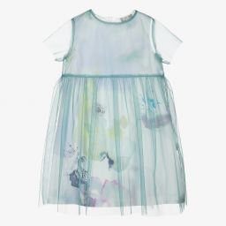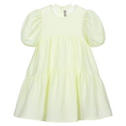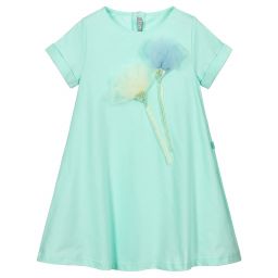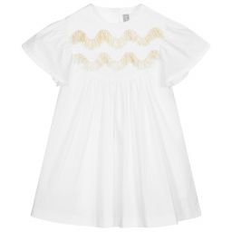 Pale pink cotton dress for little girls by classic luxury Italian brand Il Gufo, with a brown, faux fur collar. On the front is a sweet sausage dog appliqué, with faux fur ears, wearing a pink and beige checked jacket. The dress is made in comfortable jersey, drop-waisted in style and with branded button fastenings around the back.
