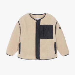Pale pink jacket for girls by classic luxury Italian brand Il Gufo. Made in beautifully soft, cosy fleece with a hood, it is ideal for cooler days. It has beige satin trims with a pretty, matching ruffle around the hemline for a feminine finish. The front zip fastening has a branded pull tab in shiny silver.