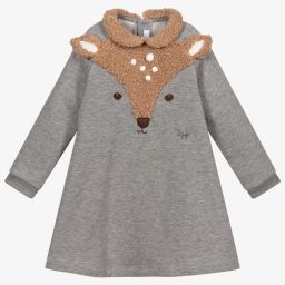 Ivory cotton sweatshirt jersey dress for younger girls by luxury brand, Il Gufo. The front has a cute deer face appliqué in soft beige teddy fleece, and an embroidered logo. Soft and comfortable, the dress has a gentle A-line shape and fastens with buttons on the back.