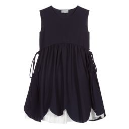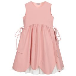 Pretty, bright yellow dress for girls by Il Gufo. Made in comfortable, silky jersey, the gathered skirt has asymmetrical panels and a scalloped hemline, with removable ties on the sides of the waist. Easy to wear, it slips on over the head and comes with a white cotton mesh slip.