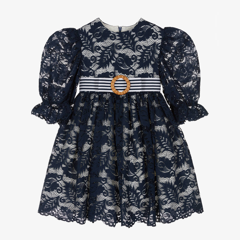 This navy blue lace dress for girls by Irpa is super stylish. Made from beautiful floral lace with a white crêpe chiffon underlayer, it features sheer puffed sleeves with subtly scalloped cuffs and hem. The attached striped belt with a pretty bow embellishment and brown wicker-style circular buckle adds a chic finish. Fastening with a concealed zip, it is lined with smooth cotton weave and an additional tulle panel for added skirt volume. Limited quantities available.