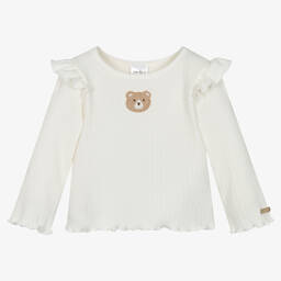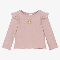 A sweet dusky pink top for baby girls by Jamiks, made in a soft and stretchy viscose blend. With a comfortable rounded neckline, this lightly ribbed top has cute frills on the shoulders and a beige teddy bear appliqué on the chest. It is finished with a fun, curly-edge trim on the hem and cuffs.